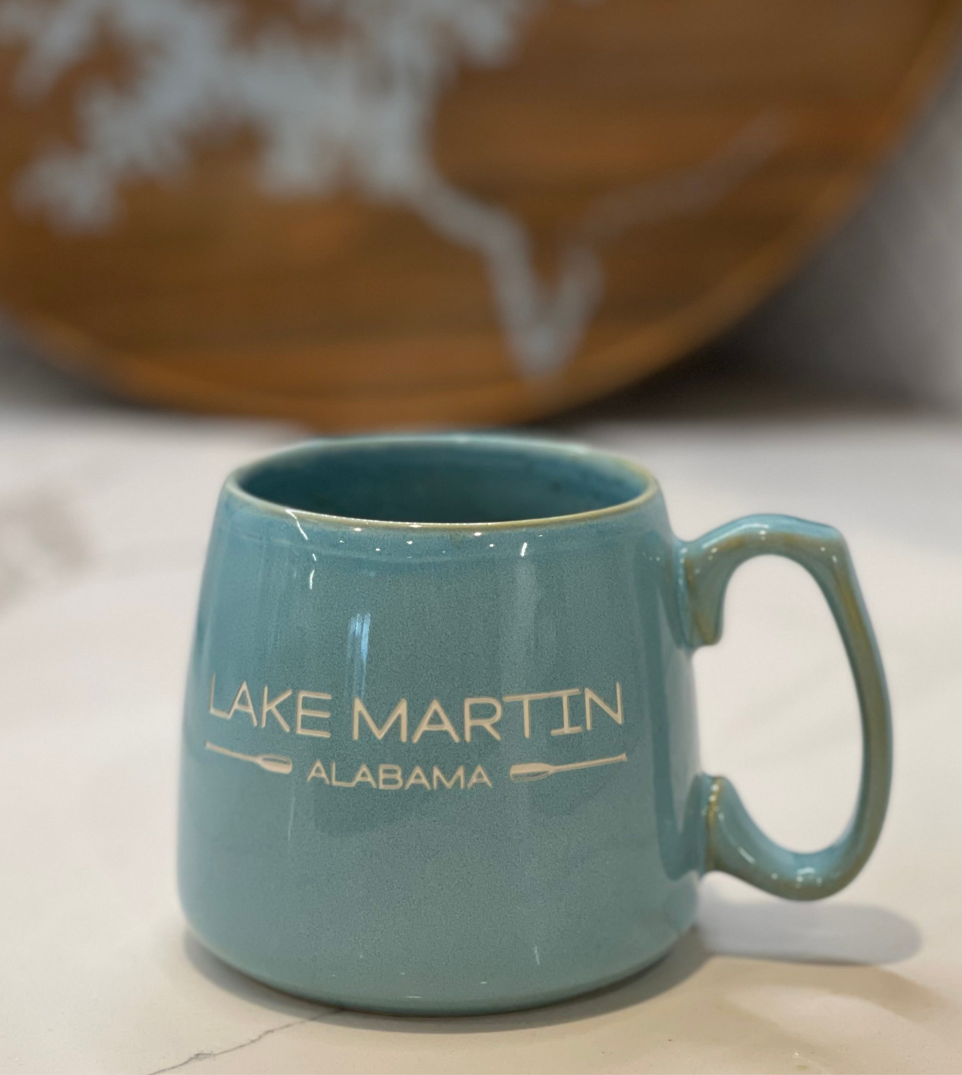 This beautiful, unique and antiqued glazed mug is deeply etched with our signature Lake Martin design. The large handle offers a comfortable grip and 15-ounce capacity that holds a generous serving of your favorite warm beverage. Offered in both deep blue and light blue/Aqua. Each piece is hand crafted and may result in slight variation in color and shape.